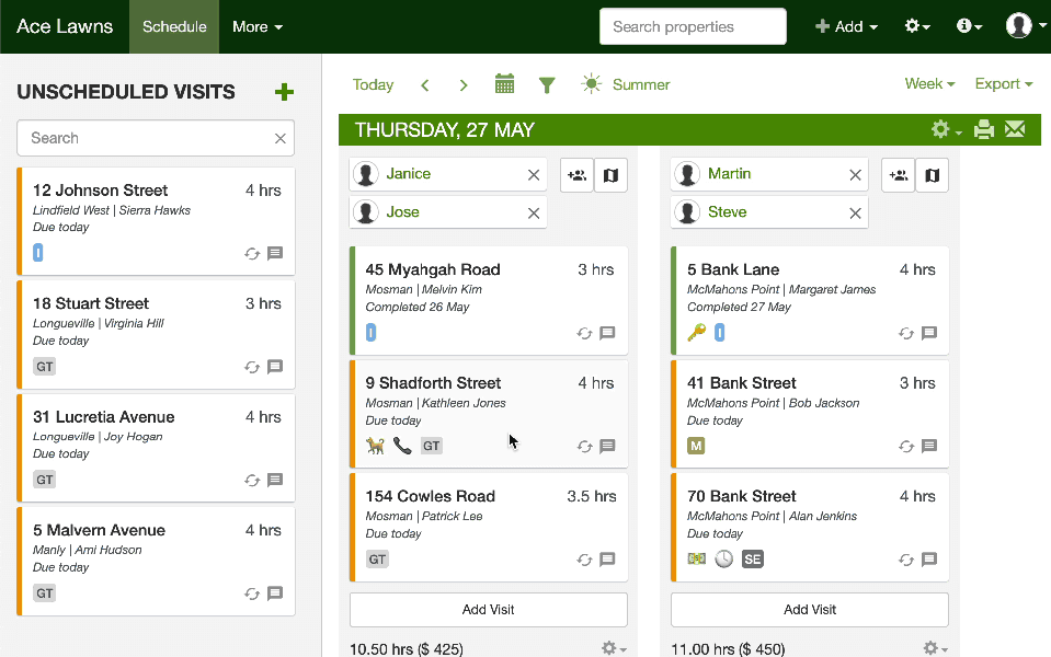- Scheduling and route optimization. Gain a 360-degree view of each crew member’s schedule with automatic route creation and a built-in mapping system.