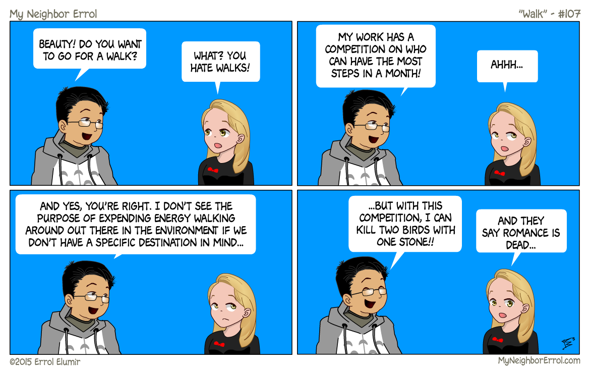Every morning and evening I spend forty minutes walking to work. I spend my lunch hour walking. And when I go home, I ask my wife to go on walks with me.