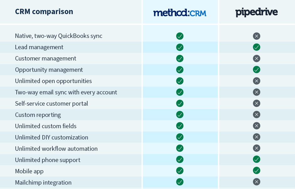 It’s important to note that QuickBooks users looking for a CRM that integrates with their accounting software should use Method CRM — not Pipedrive.
