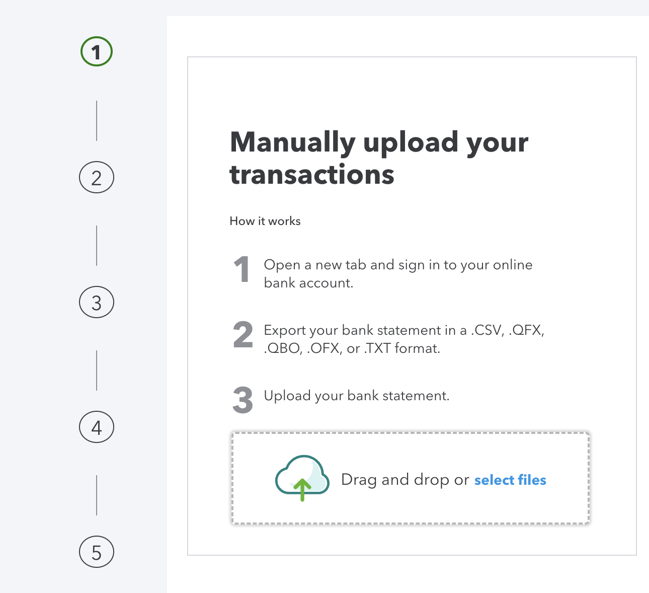 - Click the button labeled “Upload transactions” and then choose “Drag and drop or select files.”