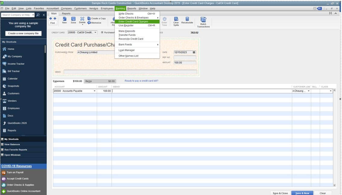 - Navigate to the “Banking” menu and select “Enter credit card charges.”