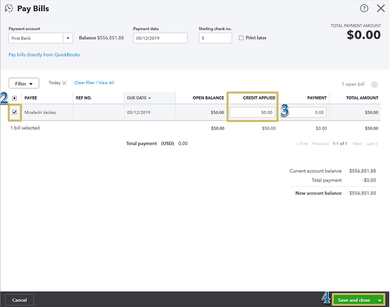 After completing the rest of the fields like you would when you pay a regular bill, ensure that the credit is present within that bill before you pay. Then hit “Save and close” to set the credit in place.