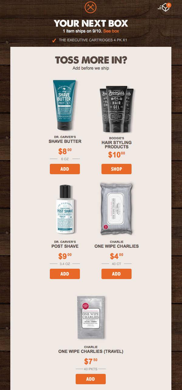 In the email below, Dollar Shave Club wisely presumes that someone who has ordered razors is interested in personal grooming, so they suggest other shaving products to add to the purchase.